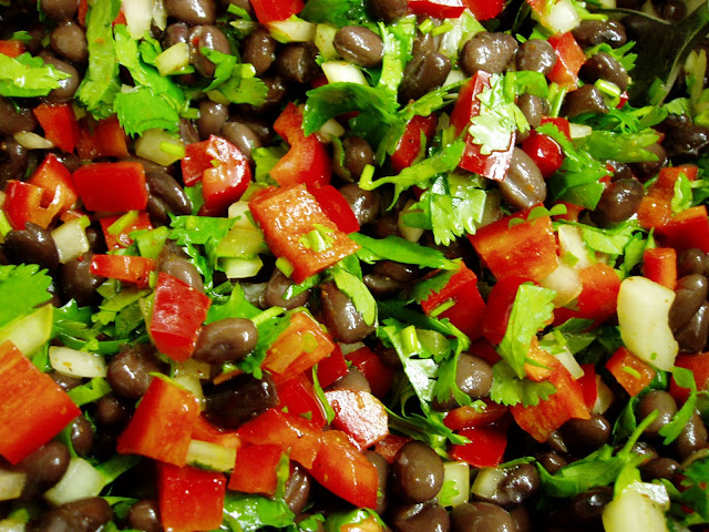 I whisked the dressing ingredients and added 1/2 an onion, diced and a large red Sheppard pepper, diced